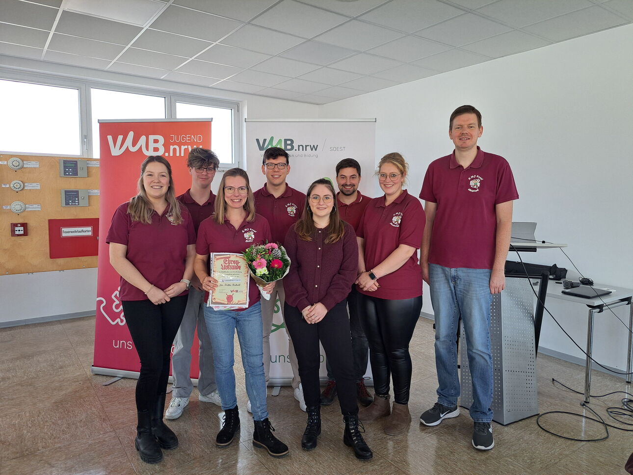 Laura Wiek (von den Hellwegmusikanten Erwitte, Pressesprecherin), Nico Struchholtz (vom Tambourcorps Altengeseke, neuer Geschäftsführer), Britta Ruholl (von den Hellwegmusikanten Erwitte. ehemalige Geschäftsführerin), Torben Bartsch (vom Tamboukorps Sichtigvor, neuer Schriftführer), Antonia Klöppner (vom Spielmannszug Niederense, neue Beisitzerin), Timo Dünschede (vom Tambourorps Rüthen, Beisitzer), Madeleine Wicker (vom Blasorchester Hellinghausen, wiedergewählte stv. Vorsitzende), Christoph Kukuk (vom Tambourcorps Hörste, Vorsitzender)