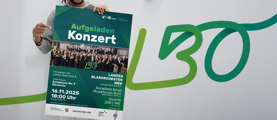 Leuchtende Fanfaren, elektrisierende Tänze, kontrastreiche Naturgewalten und feurige Rhythmen – am 16.11.2025 bringt das LBO NRW unter der Leitung des Dirigenten Martin Kirchharz im Anneliese Brost Musikforum Ruhr in Bochum unter dem Motto AUFGELADEN ein Programm auf die Bühne, das vor Energie kaum zu halten ist: Alfred Reeds kraftvolle „Armenian Dances (Part I)“, Julie Giroux‘ atemberaubende „Symphony No. V – Elements“, Philip Sparkes festliche „Jubilee Overture“, Nigel Hess‘ vielschichtige „East Coast Pictures“ und der rhythmische Sog von Arturo Márquez‘ „Danzón No. 2“ (Arr.: Oliver Nickel).
